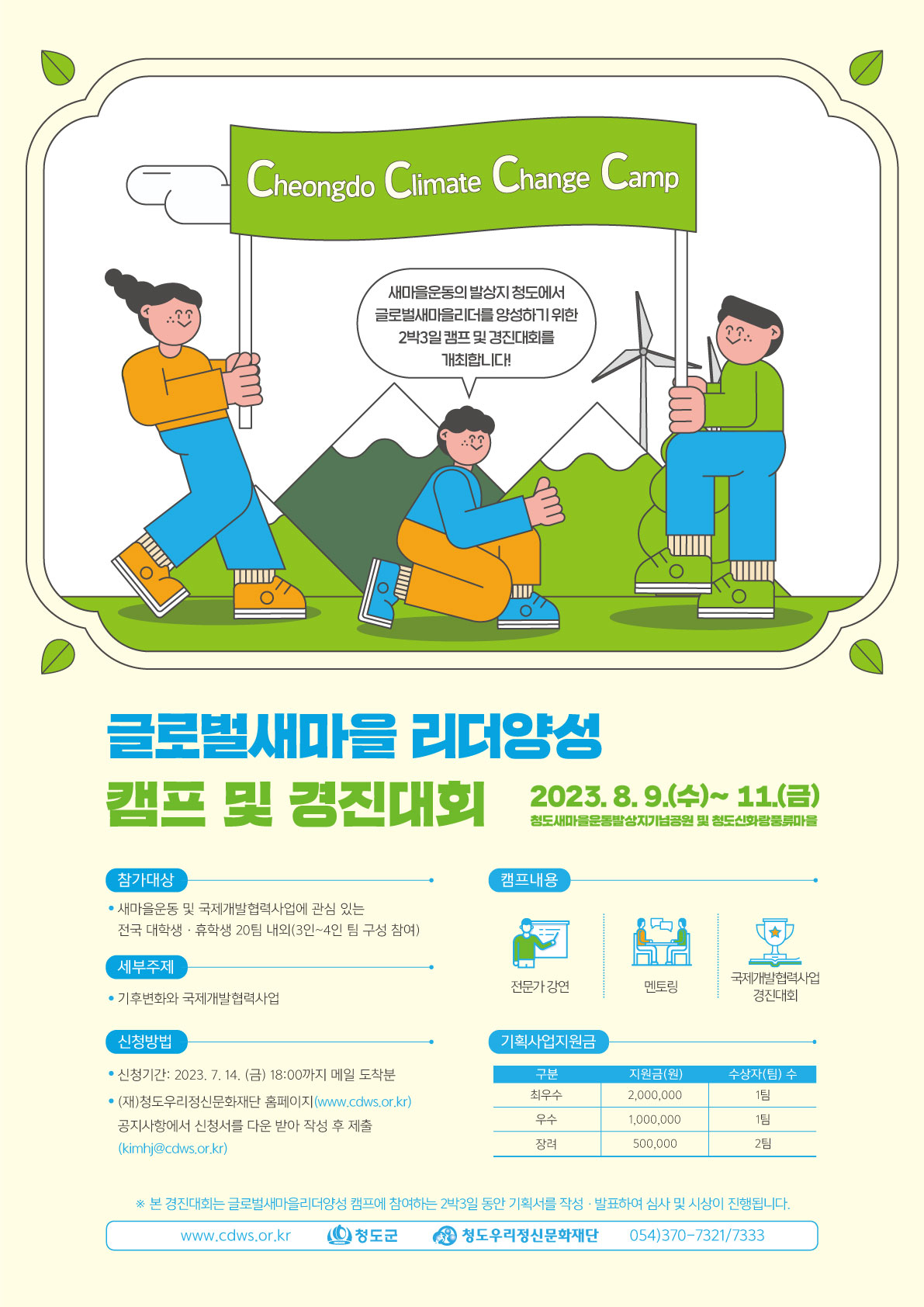 새마을운동발상지 청도에서 세계 시민의식 함양 및 다양한 국제이슈에 효과적으로 대응하기 위해 글로벌새마을리더양성을 위한 캠프 및 경진대회 개최합니다.